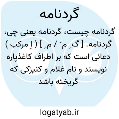 ( اسم ) ۱ - دعایی است که بر اطراف کاغذ پاره ای نویسند و نام غلام یا کنیزی را که گریخته باشد در میان آن مرقوم دارند و در زیر سنگ نهند یا در خاک دفن کنند و یا برستون خانه آویزند و بعضی در میان سور. یوسف ( قر آن ) نهند درین صورت پندارند که آن گریخته بجایی نتواند رفت و پیدا شود: گیج کرد این گردنامه روح را تا بیابد فاتح و مفتوح را. ( مثنوی ) ۲ - سوال و تقاضایی است از طرف شاهی یا بزرگی در نامه ای از عده ای از ثروتمندان محلی برای اعانت بفقیری. در ذیل آن نامه نامهای اغنیا را چون دایره ای می نوشتند و این بدان جهت بود که آنان از تاخر اسم خویش خشم نیارند. سپس آن نامه را نزد هر یک از ایشان می بردند و او در زیر نام خود مبلغی تعهد میکرد: گردنامه است که شه اهل هنر را کرده است شکل تدویر که بر دایر. دینار است. ( رضی نیشابوری )