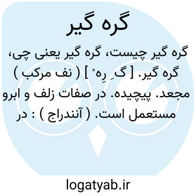 ( صفت ) ۱ - گره دار باگره. ۲ - چین دار پر چین: کمان ابرویش گر شد گره گیر کرشمه بر بدن میراند چون تیر. ( نظامی ) ۳ - مجعد پیچیده ( زلف و مانند آن ): خند. جام می و زلف گره گیر نگار ای بسا توبه که چون توب. حافظ بشکست. ( حافظ ) ۴ - گلو گیر: در دلم غصه ای گره گیر است چرخ تسکین آن دهد ? ندهد. ( خاقانی )