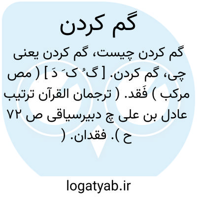( مصدر ) ۱ - مفقود کردن از دست دادن: بدان گونه شد شیر در کارزار چه شیری که گم کرده باشد شکار. ۳ - نابود کردن از بین بردن: چون باز آمد هابیل را نیافت بدانست که قابیل او را گم کرد برو لعنت کرد. ۴ - ترک کردن رها کردن: همان و همین ایزدت بهره داد همی گم کنی تو به بیداد داد. ۵ - گمراه کردن: گرم ره نمایی رسیدم بخیر و گرگم کنی باز مانم ز سیر. ( بوستان سعدی ) یا دست و پای خود را گم کردن. بر اثر وقوع حادثه ای یا امری مهم عقل و تمیز خود را از دست دادن. یا گم کردن کسی را از جهان. میرانیدن او را کشتن. یا گم کردن خود را. ۱ - حواس خود را از دست دادن دست پاچه شدن. ۲ - پس از فقر بمال و جاهی رسیدن و فقر سابق را فراموش کردن و تکبر ورزیدن. یا گم کردن راه را. از راه به بیراهه افتادن.