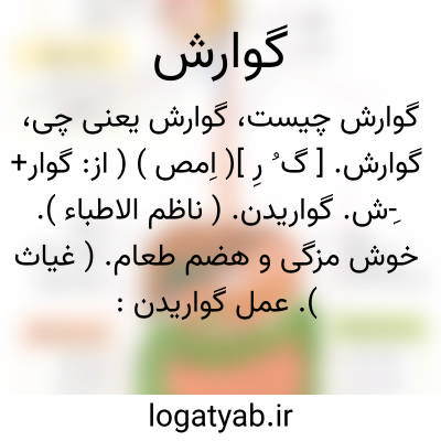 ۱ - ( اسم ) هضم غذا: خورش را گوارش می افزون کند ز تن ماندگیها به بیرون کند. ( اسدی ) یا دستگاه گوارش. یا جهاز هاضمه دستگاهی که شامل اعضای مربوط بتغذی. موجود زنده ( خوردن هضم جذب و دفع ) میباشد. دستگاه گوارش در انسان عبارتست از لوله ای پرپیچ و خم که از دهان شروع و بمخرج ختم میشود و ضمایمی بنام غدد دارد که ترشحات خود را در قسمتهای مختلف این لوله میریزند. لول. گوارش در امتداد خود گشاد و تنگ میباشد. مواد غذایی که وارد دستگاه گوارش میشوند در هر یک از قسمتهای تحت تاثیر عوامل فیزیکی و شیمیایی اعضای مربوط قرار میگیرند و غذا در آنها مراحل مختلفی را طی میکند. قسمتی از غذا که مفید و قابل استفاده برای حیات است هضم و گوارده میشود و بعد جذب میگردد یعنی داخل خون شده و جزو بدن میشود و قسمتی که غیر مفید است از طرق مختلف بشکل فضولات بخارج دفع میگردد. بطور کلی دستگاه گوارش شامل اعضائ و قسمتهای زیر است: ۱ - دهان و غده های آن. ۲ - مری. ۳ - معده. ۴ - روده ها. ۵ - کبد ( جگر سیاه ). ۶ - لوزالمعده. ۷ - طحال. ۲ - ( اسم ) معجونی است که برای هضم طعام سازند و خورند جوارش: بزرجمهر گفت که برای خود گوارش ساخته ام از شش چیز هر روز از آن لختی میخورم.
