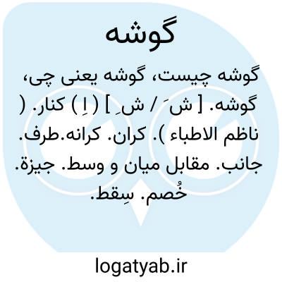 ( اسم ) ۱ - کنار کناره کران: اسرائیل بحضرت آمد. سلطان او را ترحیب... تمام کرد و با خویشتن در گوش. تخت بنشاند بالای تمام امرا. یا از ( ز ) گوشوری به گوشوری. از کران تا کران سراسر: در فکند سرخ مل بر طل دو گوشه روشن گردد جهان ز گوشه بگوشه. ( منوچهری ) یا گوش. جام شکسته. ماه نو. یا گوش. جگر. ۱ - کنار. جگر. ۲ - فرزند جگر گوشه. یا گوش. چشم. ۱ - کنج چشم:... اگر گوش. چشم بخشم بر فلک کبود پوش سرخ کردی... ۲ - کمترین نگاه. ۳ - اندک توجه. ۴ - غمزه. یا گوش. خاطر. اندک میل باطن: مگر گوش. خاطرش با جمال یکی از شاگردان میلی داشت. یا گوش. دهان ( دهن ). کنج دهن. یا به گوش. چشم نگریستن. التفات اندک کردن. یا گوش. ابرو بلند شدن ( کردن ). بی حوصله و بی دماغ شدن. یا گوش. ابرو ترش کردن. غضبناک شدن. یا گوش. ابرو جنبانیدن. بگوش. ابرو اشاره کردن. یا به گوش. ابرو گره بستن. خشمگین شدن. یا گوش. ابرو نمودن. بگوش. ابرو اشاره کردن. یا گوش. چشم بکسی کردن. توجه کردن التفات نمودن: آنان که خاک را بنظر کیمیا کنند آیا بود که گوش. چشمی به ما کنند ? ( حافظ ) یا گوش. چیزی را شکستن. ۱ - خم دادن گوش. آنرا ( کلاه دستار نقاب و غیره ): کدام زهره جبین گوش. نقاب شکست که رعشه ساغر زرین آفتاب شکست. ( صائب ) ۲ - جدا کردن قسمتی از کنار. چیزی. ۲ - کنج زاویه. ( اطاق و غیره ). ۳ - زاویه: هر مثلث را سه گوشه است. یا گوش. باز. زاوی. منفرجه.یا گوش. تند. زاوی. حاده. ۴ - طرف سوی جانب: سلجوقیان از هر گوشه ای رجعت کردند. ۵ - قطعه ناحیه: نامه ای نوشت و از کشور او گوشه ای بخواست که آنجا آرام سازد. ۶ - جای دور دست خلوت جای: ازاین قوم که من سخن خواهم گفت یک دو تن زنده اند و در گوشه ای افتاده... یا گوش. انزوا. کنج انزوا گوش. خلوت. یا گوش. بی کسی. کنج غربت. یا به گوشه بودن. بر کنار بودن دور بودن. یا گوش. باغی گرفتن. ۱ - در گوش. باغی اقامت کردن. ۲ - خلوت گزیدن. ۷ - حلقه. یا حلق. زنجیر. حلق. زنجیر. ۸ - دندانه ا آی در سر زه کمان که زه را بدور آن می پیچند دو سر کمان: و چون بحقیقت نگاه کنی کمان سینه و دست مردم است یکی دست باز کشد و پشت دست باز خماند سینه چون قبضه گاه و بازو و ساعد دو خانه و دو دست دو گوشه. یا گوش. کمان. هر یک از دو قسمت نزدیک بدو سر کمان خم گوش. کمان: هران کمان که بجنباندش کس او بکشد چنانکه سر بهم آرند گوشه های کمان. ( عنصری ) ۹ - دست. آوند دستاویز: مقبض عروه. ۱٠ - گردنا گردانک. ۱۱ - دردی که در گوش. ناخن پدید آید از جمع شدن چرکی اندک در آن و آن خفیف تر از عقربک است داحس. ۱۲ - کنایه تعریض. ۱۳ - قسمتی از یک دستگاه. توضیح در هر دستگاه بنابر آنکه بیک پله بیشتر اهمیت داده شود آن پله بیشتر اهمیت داده شود آن پله معرف یک گوشه و یا مقام میگردد ٠ ممکن است یک پله معرف چند مقام باشد در این صورت اختلاف آنها بر سر سبکی است که روی آن بازی میکنند ٠ یا گوش. طرز ٠ گوشه ای از دستگاه همایون ۱۴ ٠ - بندی از کاغذ بشکل مثلث قائمالزاویه که پشت آن چسبناک است و بوسیل. آن عکس را در آلبوم الصاق کنند. ۱۵ - هر یک از دو مثلث ( فوقانی و تحتانی ) هر رویه از جلد کتاب که آنرا با کاغذ یا چرم برنگی غیر از رنگ روی. جلد صحافی کنند.