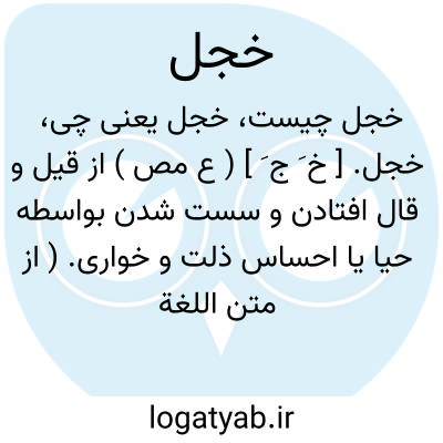 شرمنده، شرمسار. خجالت. خواجه. خَجل یا خِجل ممکن است در زبان معیار باستان به دو بخش خج - ائل قابل تجزیه باشد.