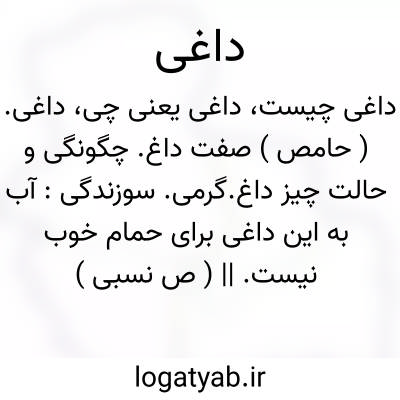 داغی. ( حامص ) صفت داغ. چگونگی و حالت چیز داغ.گرمی. سوزندگی: آب به این داغی برای حمام خوب نیست. || ( ص نسبی ) بداغ. داغ شده. نشان شده باآهن تفته. دارای داغ. || کنایه از معیوب است. ( آنندراج ). || در ترکیب «آتشین داغی » می نماید که ملتهب از شوق و خواهانی باشد: