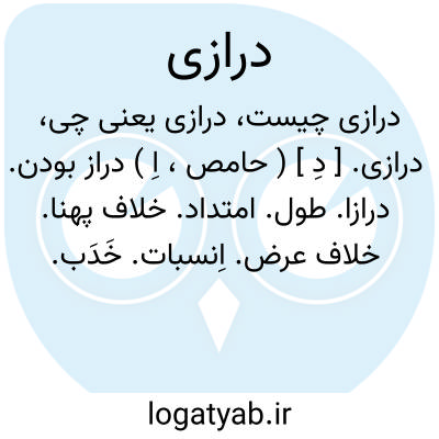 درازی. [ دِ ] ( حامص، اِ ) دراز بودن. درازا. طول. امتداد. خلاف پهنا. خلاف عرض. اِنسبات. خَدَب. سَمحَجَة. سَنطَلَة. سَیفة. ( منتهی الارب ):