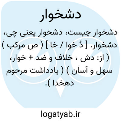 دشخوار. [ دُ خوا / خا ] ( ص مرکب ) ( از: دش، خلاف و ضد + خوار، سهل و آسان ) ( یادداشت مرحوم دهخدا ). مشکل و دشوار. ( غیاث ). دشوار. ( آنندراج ). به معنی دشوار که امور مشکله است. ( لغت محلی شوشتر، نسخه خطی ). اَرْوَنان. باهِظ. سخت. صعب. عَسِر. عَسیر. عَویص. غامض. مشکل. مقابل خوار که به معنی آسان و سهل است. ( یادداشت مرحوم دهخدا ):