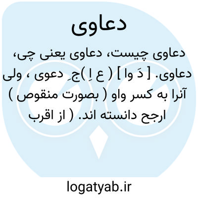 دعاوی. [ دَ وا ] ( ع اِ )ج ِ دعوی، ولی آنرا به کسر واو ( بصورت منقوص ) ارجح دانسته اند. ( از اقرب الموارد ). رجوع به دَعاوی شود.