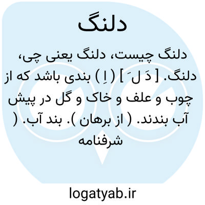 دلنگ. [ دَ ل َ ] ( اِ ) بندی باشد که از چوب و علف و خاک و گل در پیش آب بندند. ( از برهان ). بند آب. ( شرفنامه منیری ). || ژوبین، و آن نیزه ای باشد کوتاه که سنان آن دو پره نیز می باشد و به جانب خصم اندازند. ( از برهان ). حربه ای است چون نیزه کوچک که آنرا شل گویند. ( آنندراج ) ( از جهانگیری ). || غلاف خوشه خرما. ( الفاظ الادویة ). غلاف خوشه خرما و آنچه شاخ خرما بر آن باشد. ( برهان ). آنچه شاخ خرما بر او باشد. ( شرفنامه منیری ). آنرا دشنگ نیز گویند. ( از آنندراج ). || دست افزار چاه کنان که آنرا میتین خوانند. ( از برهان ). آلتی است آهنین دراز که آنرا میتین نیز گویند. ( از شرفنامه منیری ).