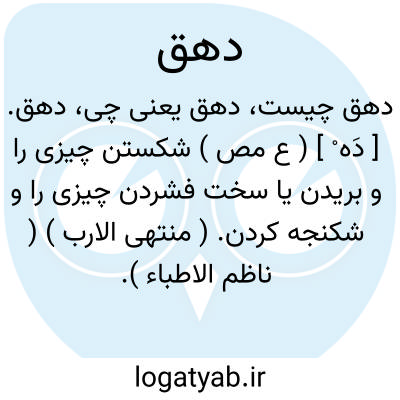 دهق. [ دَه ْ ] ( ع مص ) شکستن چیزی را و بریدن یا سخت فشردن چیزی را و شکنجه کردن. ( منتهی الارب ) ( ناظم الاطباء ). شکستن. ( المصادر زوزنی ). || زدن کسی را. || پر کردن جام را. پر کردن. ( از المصادر زوزنی ). || سخت ریختن آب را. ( از لغات اضداد است ). ( منتهی الارب ). || بخشیدن به کسی اول مال را. ( منتهی الارب ) ( ناظم الاطباء ). || پاره کردن. ( المصادر زوزنی ).