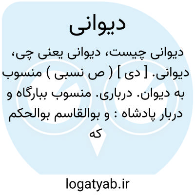 دیوانی. [ دی ] ( ص نسبی ) منسوب است به دیوان که نام کوچه ای است بمرو و عده ای بدان منسوبند. ( از انساب سمعانی ).