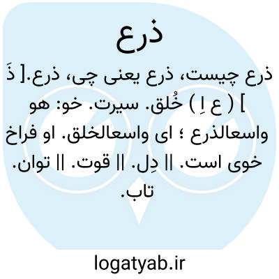 ذرع.[ ذَ ] ( ع اِ ) خُلق. سیرت. خو: هو واسعالذرع؛ ای واسعالخلق. او فراخ خوی است. || دِل. || قوت. || توان. تاب. توانائی. طاقت. ذراع. ضاق بالأمر ذرعه؛ سست و ضعیف شد طاقت او و بمقصود نرسید یا از مکروهات نجات نیافت. و یقال، ابطرت فلاناً ذرعه؛ ای کلفته اکثر من طوقه. || دل؛ کبر فی ذرعی ای فی قلبی، ای عظم وقعه و جل عندی. || تن. نفس: اقصد بذرعک؛ نرمی و رفق کن با تن خود. || قدر. ذرع کل شی ٔ؛ قدره مما یذرع. || گوشه کشت. رودکی گوید:
