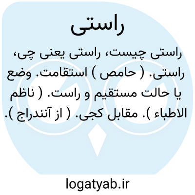 || مقابل چپ بودن: وی را پرسیدند که چرا زینت بچپ دادی و فضلیت راست راست ؟ گفت آن را زینت راستی تمام است. ( گلستان ). || صدق و صداقت. ( ناظم الاطباء ). بمعنی راست بودن. مقابل دروغ. ( از شعوری ). صحت و درستی. مقابل ناراستی: صدق، راستی. ضد کذب. ( منتهی الارب ) ( دهار ). صداقت؛ راستی. ( منتهی الارب ). مصدوقه؛ راستی. ( منتهی الارب ):