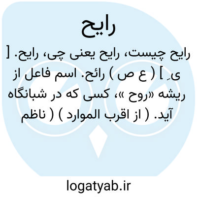 رایح. [ ی ِ ] ( ع ص ) رائح. اسم فاعل از ریشه «روح »، کسی که در شبانگاه آید. ( از اقرب الموارد ) ( ناظم الاطباء ). ج، رَوْح. ( المنجد ). شبانگاه آینده. ( منتهی الارب ). || کسی که در شبانگاه کاری کند. ج، رایحون. || مرد شادمانی کننده. ج، رایحون. || مردی که در افعال مشابه پدر باشد. ج، رایحون. ( ناظم الاطباء ). || باران شبانگاهی. ( مهذب الاسماء ).