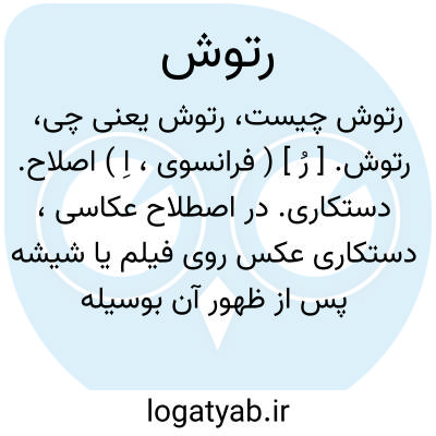 رتوش. [ رُ ] ( فرانسوی، اِ ) اصلاح. دستکاری. در اصطلاح عکاسی، دستکاری عکس روی فیلم یا شیشه پس از ظهور آن بوسیله رنگ و مداد مخصوص، جهت زیبا کردن حالت و قیافه تصویر. ( از فرهنگ فارسی معین ).