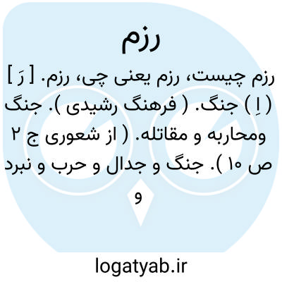 رزم. [ رَ ] ( اِ ) جنگ. ( فرهنگ رشیدی ). جنگ ومحاربه و مقاتله. ( از شعوری ج 2 ص 10 ). جنگ و جدال و حرب و نبرد و پیکار. ( ناظم الاطباء ). نبرد و پیکار. ( فرهنگ فارسی معین ). جنگ و جدال. ( فرهنگ جهانگیری ) ( برهان ) ( لغت محلی شوشتر نسخه خطی کتابخانه مؤلف ) ( فرهنگ فارسی معین ) ( غیاث اللغات ) ( فرهنگ سروری ). جنگ و پیکار و با لفظ برانگیختن و راندن مستعمل. ( آنندراج ). مخاصمه در میان دو گروه ارتش یا دو گروه مردم. ( لغات فرهنگستان ). جنگ باشد. ( فرهنگ خطی ). کارزار. ( فرهنگ اوبهی ). جنگ. زد و خورد. محاربه. ( فرهنگ لغات شاهنامه ). آورد. کارزار. پیکار. پرخاش. فرخاش. ناورد. نبرد. وغا. هیجا. جنگ. جدال. جدل. مقابل بزم. ( یادداشت مؤلف ):