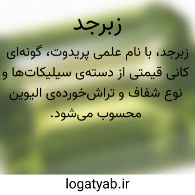 (زَ بَ جَ ) [ ع. ] (اِ. ) سنگی است قیمتی که در جواهرسازی مورد استفاده قرار می گیرد که مهم ترین آن به رنگ سبز می باشد.