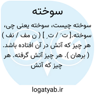 سوخته.[ ت َ / ت ِ ] ( ن مف / نف ) هر چیز که آتش در آن افتاده باشد. ( برهان ). هر چیز آتش گرفته. هر چیز که آتش درآن افتاده باشد. محروق. ( ناظم الاطباء ):