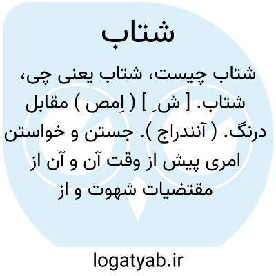 شتاب. [ ش ِ ] ( اِمص ) مقابل درنگ. ( آنندراج ). جستن و خواستن امری پیش از وقت آن و آن از مقتضیات شهوت و از صفات مذمومه باشد. عجله. ( یادداشت مؤلف ). اشتاب. اشتو ( درتداول عامه گناباد ). سرعت. عجل. دستپاچگی. تندی. مقابل درنگ و آهستگی. تعجیل. مقابل کندی: