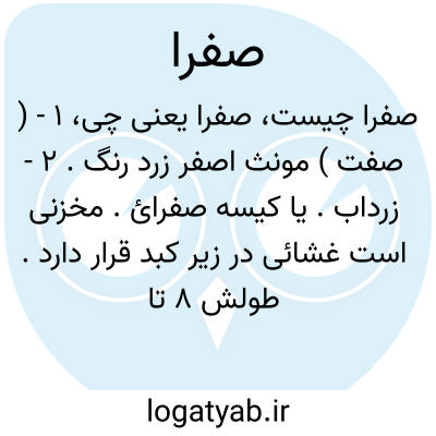 ۱ - ( صفت ) مونث اصفر زرد رنگ. ۲ - زرداب. یا کیسه صفرائ. مخزنی است غشائی در زیر کبد قرار دارد. طولش ۸ تا ۱٠ سانتیمتر و پهنایش ۳ تا ۴ سانتیمتر است و دارای سه قسمت تنه و قعر و گردن می باشد. صفرائی که از کبد ترشح می شود از مجرای کبدی گذشته و وسیله کانال سیستیک وارد کیسه صفرا می شود و در آن جا غلیظ شده و به تناوب وسیله مجرای کلدوک در اثنا عشر وارد می شود مخزن صفرا. یا مخزن صفرائ. کیسه صفرا. ۳ - کیسه صفرائ کیسه زرداب. ۴ - خشم غضب. ۵ - هوس سودا. ۶ - جامه ای که در آن خطهایی زرد باشد. یا صفرائ بر سر زدن. تند و عصبانی شدن. یا صفرائ به سر آمدن. اندوهگین شدن.