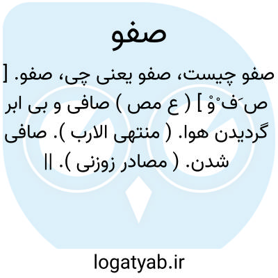صفو. [ ص َف ْوْ ] ( ع مص ) صافی و بی ابر گردیدن هوا. ( منتهی الارب ). صافی شدن. ( مصادر زوزنی ). || بسیارشیر گردیدن ناقه. ( منتهی الارب ). || گرفتن خلاصه دیگ را. ( منتهی الارب ). || ( اِمص ) روشنی. ( منتهی الارب ). نابی. ویژگی. بی آمیغی. خلاف کدر. || ( ص، اِ ) خالص و برگزیده ٔاز هر چیزی. ( منتهی الارب ). چیزی برگزیده. ( دهار ).
