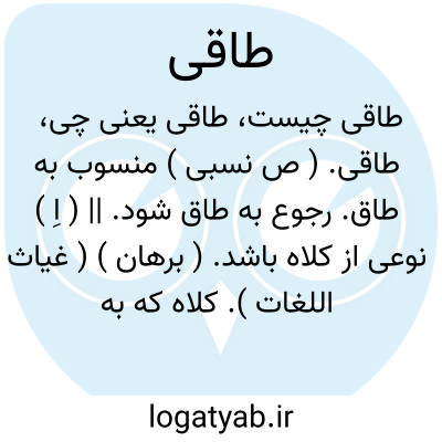 طاقی. ( ص نسبی ) منسوب به طاق. رجوع به طاق شود. || ( اِ ) نوعی از کلاه باشد. ( برهان ) ( غیاث اللغات ). کلاه که به صورت طاق سازند. طاقین. طاقیه: