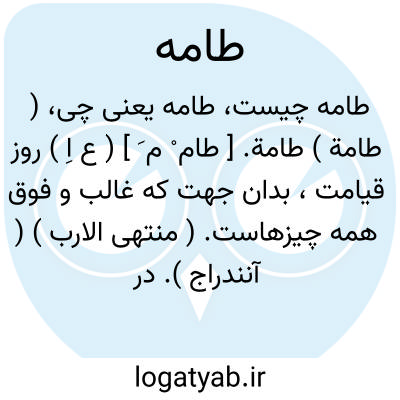 ( طامة ) طامة. [ طام ْ م َ ] ( ع اِ ) روز قیامت، بدان جهت که غالب و فوق همه چیزهاست. ( منتهی الارب ) ( آنندراج ). در لغت روز قیامت را گویند کما فی الصراح. ( کشاف اصطلاحات الفنون ). نامی است رستاخیز را. ( مهذب الاسماء ). قیامت. ( ترجمان علامه جرجانی ص 66 ). روز جزا. یوم البعث. یوم النشور. یوم الحساب. روز شمار. روز بازخواست. روز حشر. روز قیام. یوم الیقین. || بلا، که غالب و فوق همه بلاها باشد. ( منتهی الارب ) ( آنندراج ). داهیه. ( مهذب الاسماء ). سختی.