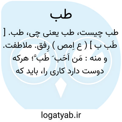 طب. [ طَب ب ] ( ع اِمص ) رِفق. ملاطفت. و منه: مَن اَحَب َ طَب َّ؛ هرکه دوست دارد کاری را، باید که آهستگی و نرمی کند و شتابزدگی نکند. ( منتهی الارب ) ( آنندراج ). || فُسون. جادوئی. ( منتهی الارب ) ( آنندراج ). || ( ص ) دانا. ( منتهی الارب ). نیک ماهر در کار خود. یقال: فلان ٌ طَب ٌ بکذا؛ عالم ٌ به. ( منتهی الارب ) ( آنندراج ). مرد حاذق. ( دهار ). پزشک دانابه دارو و علاج و درمان. طبیب. ( منتهی الارب ). || فحل ٌ طَب ٌ؛ دانا و ماهر در طُرُق ضِراب. ( منتهی الارب ) ( اقرب الموارد ). || شتر تیزهوش که تا جای نبیند پای ننهد. ( منتهی الارب ) ( آنندراج ).