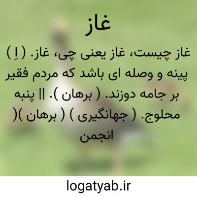 برند غاز سخن شاعران ز غوزه من.سوزنی. || برهم زدن پشم کهنه تا نیک بتوان رشت و آن را به تازی نکث نامند. ( جهانگیری ) ( برهان ). || شکاف. ( برهان ) ( فرهنگ رشیدی ). و در کلمه شب غاز ( جای بسر بردن گاوان و گوسفندان در شب )، غاز از همین ریشه است. پاره و باز شده و شکافته. || از هم شکافتن. چاک و تراک. ( برهان ). || نیاز. ( جهانگیری ) ( برهان ). حاجت. احتیاج. ( برهان ):