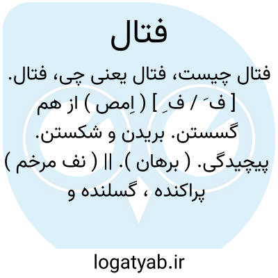 فتال. [ ف َ / ف ِ ] ( اِمص ) از هم گسستن. بریدن و شکستن. پیچیدگی. ( برهان ). || ( نف مرخم ) پراکنده، گسلنده و کشنده. ( فرهنگ اسدی ). در این معنی بصورت پساوند فاعلی استعمال شودو مرخم فتالنده است، مانند گهرفتال و زره فتال. در حاشیه فرهنگ اسدی نخجوانی این کلمه بجای فتالیدن آورده شده و با شواهدی از شعرا معنی آغازیدن و افشاندن و گسستن میدهد. ( از یادداشت بخط مؤلف ):