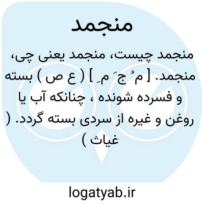 منجمد. [ م ُ ج َ م ِ ] ( ع ص ) بسته و فسرده شونده، چنانکه آب یا روغن و غیره از سردی بسته گردد. ( غیاث ) ( آنندراج ). بسته و فسرده و هر چیز صلب و سخت و ضد مایع. ( ناظم الاطباء ): اگرچه کرم این بزرگان مغلق ابد است و چشمه سخای این مهتران منجمد سرمدی... ( منشآت خاقانی چ محمد روشن ص 250 ).