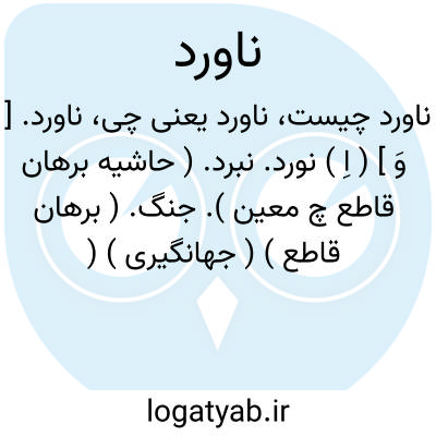 ناورد. [ وَ ] ( اِ ) نورد. نبرد. ( حاشیه برهان قاطع چ معین ). جنگ. ( برهان قاطع ) ( جهانگیری ) ( انجمن آرا ) ( فرهنگ نظام ) ( حاشیه فرهنگ اسدی نخجوانی ) ( غیاث اللغات ) ( اوبهی ) ( فرهنگ اسدی ) ( ناظم الاطباء ) ( فرهنگ رشیدی ). جدال. ( برهان قاطع ) ( آنندراج ) ( ناظم الاطباء ) ( جهانگیری ) ( انجمن آرا ) ( فرهنگ رشیدی ). نبرد. ( فرهنگ اسدی ). آورد. جنگ کردن به مبارزت. ( حاشیه فرهنگ اسدی نخجوانی ). جدل. تاختن. ( غیاث اللغات ). رزم. مبارزت. ( اوبهی ). نبرد. جنگ دو کس یا دو لشکر. آورد. ( از فرهنگ اسدی ). حرب. کارزار. پرخاش. فرخاش. وغا. هیجا. ستیز: