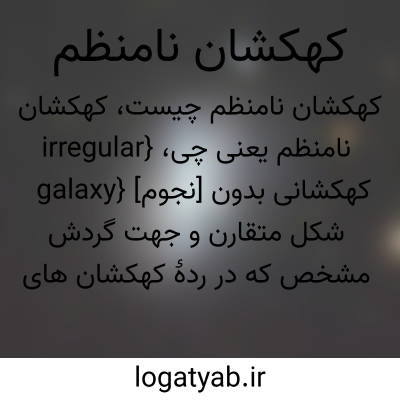 {irregular galaxy} [نجوم] کهکشانی بدون شکل متقارن و جهت گردش مشخص که در ردۀ کهکشان های مارپیچی و کهکشان های بیضوی نمی گنجد