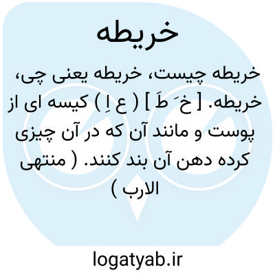خریطه. [ خ َ طَ ] ( ع اِ ) کیسه ای از پوست و مانند آن که در آن چیزی کرده دهن آن بند کنند. ( منتهی الارب ) ( از تاج العروس ) ( از لسان العرب ). ج، خَرائط. ظبیة. خلیته. کریتا. کیسه. ( یادداشت بخط مؤلف ):