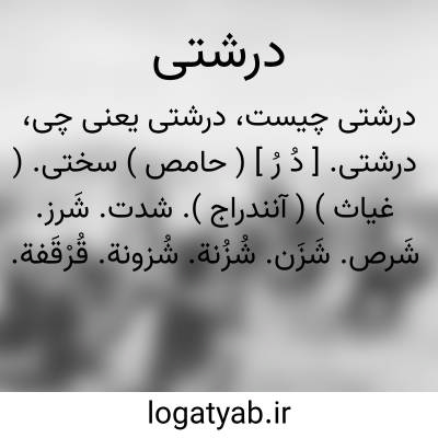 درشتی. [ دُ رُ ] ( حامص ) سختی. ( غیاث ) ( آنندراج ). شدت. شَرز. شَرص. شَزَن. شُزُنة. شُزونة. قُرْقَفة. قَعْضَبة. ( منتهی الارب ). || صلابت. ( یادداشت مرحوم دهخدا ). جُساءة. جَلَد. عَرْدَمة. عَلَب. قَرْدَسة. قَزَب. قَعْسَرة. مَعَز. ( منتهی الارب ). || ناهمواری. ( آنندراج ): حزونت؛درشتی زمین. ( از یادداشت مرحوم دهخدا ):