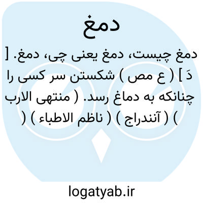 دمغ. [ دَ ] ( ع مص ) شکستن سر کسی را چنانکه به دماغ رسد. ( منتهی الارب ) ( آنندراج ) ( ناظم الاطباء ) ( المصادر زوزنی ) ( تاج المصادر بیهقی ) ( از ترجمان القرآن جرجانی ص 49 ) ( از اقرب الموارد ). || زدن بر دماغ کسی. || درد رسانیدن آفتاب به دماغ کسی. ( منتهی الارب ) ( آنندراج ) ( ناظم الاطباء ) ( از اقرب الموارد ). || ذبح کردن جهت مهمانی کسانی گوسپند لاغر و یا گوسپند فربه را. ( منتهی الارب ) ( ناظم الاطباء ) ( از اقرب الموارد ). || نیست کردن. نابود کردن. ( یادداشت مؤلف ). || غالب آمدن حق بر باطل و از میان بردن آن. ( از اقرب الموارد ). || باطل کردن. ( تاج المصادر بیهقی ) ( المصادر زوزنی ) ( ترجمان القرآن جرجانی ص 49 ). || خوار کردن. ( تاج المصادر بیهقی ). مغلوب کردن. ( از اقرب الموارد ).