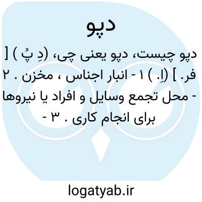 (دِ پُ ) [ فر. ] (اِ. ) ۱ - انبار اجناس، مخزن. ۲ - محل تجمع وسایل و افراد یا نیروها برای انجام کاری. ۳ - کارگاه تعمیر و توقف لکوموتیو و نگه داری تجهیزات و انباشت پارسنگ، آمادگاه (فره ).