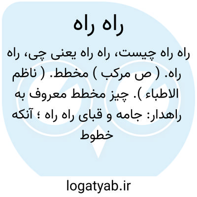 راه راه. ( ص مرکب ) مخطط. ( ناظم الاطباء ). چیز مخطط معروف به راهدار: جامه و قبای راه راه؛ آنکه خطوط رنگین داشته باشد. ( از بهار عجم ). الیجه. ( یادداشت مؤلف ). الجه؛ مخفف الاجه ترکی، جامه راه راه رنگارنگ. ( فرهنگ لغات دیوان البسه نظام قاری ). راه را. رارا ( مخفف راه راه در تداول عامه ). ( یادداشت مؤلف ). دارای خطوط متوازی نمایان و متمایز از متن پارچه خواه برجسته و خواه غیر برجسته. دارای خطوط متوازی و متمایز از متن پارچه در جهت تار. راهدار. دارای راه: مخمل راهدار؛ کبریتی: