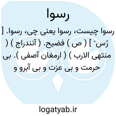رسوا. [ رُس ْ ] ( ص ) فضیح. ( آنندراج ) ( منتهی الارب ) ( ارمغان آصفی ). بی حرمت و بی عزت و بی آبرو و بدنام و مفتضح. ( فرهنگ فارسی معین ). مفتضح.کسی که بر بدی آشکار شده، مثال: فلان رسوا شده است وخبر ندارد. ( فرهنگ نظام ). کیاده. ( لغت فرس اسدی، نسخه خطی کتابخانه نخجوانی ). فضوح. مفتضح. ( منتهی الارب ). خَزی. ( یادداشت مؤلف ). فضیح. بدنام. معروف به بدی. مشهور به کاری بد. که عیبهای پوشیده او پیدا و فاش شده است. ننگین. ( یادداشت مؤلف ):