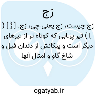 زج. [ زُ ] ( اِ ) تیر پرتابی که کوتاه تر از تیرهای دیگر است و پیکانش از دندان فیل و شاخ گاو و امثال آنها است. ( از فرهنگ نظام ) ( از رشیدی ). تیر پرتاب که پیکان آنرا از استخوان فیل و شاخ قوچ و گاومیش و امثال آن ساخته باشند. ( ناظم الاطباء ) ( از برهان قاطع ). و با جیم فارسی نیز آمده. ( از برهان ). تیر پرتاب که کوتاه تر از تیرهای دیگر است و پیکان آن از دندان پیل، لهذا آنرا فیلک و پیلک نیز خوانند. دندان گوساله نیز خود نوعی تیر است، و مرا در این تأملست، زیرا زج بمعنی تیر پرتاب عربی باشد نه پارسی یا معرب، چه در فرهنگ جهانگیری نیافتم، و در شرح قاموس بمعنی پیکان تیرآمده و مؤلف آن گفته، زج بالفتح بمعنی نیزه زدن و تیر انداختن... ( از انجمن آرای ناصری ) ( از آنندراج ).تیر پرتاب باشد که پیکان آنرا از دندان فیل و شاخ گاو و امثال آن ساخته باشند. ( جهانگیری ):