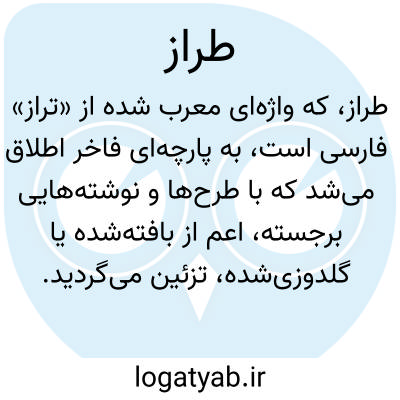 طراز. [ طِ ] ( معرب، اِ ) نگار جامه. ( منتهی الارب ). معرب است.( منتهی الارب ) ( صحاح ). اصل این کلمه تراز فارسی و معرب است، سیوطی در کتاب «المزهر» گوید: فممّا اخذوه ( ای العرب ) من الفارسیة، الطراز. زوزنی در کتاب المصادر خویش گوید: التطریز بر جامه طراز کردن. طراز جامه.( قوافی امیر علیشیر ). علم ثوب. ( زمخشری ) ( صحاح ). علم جامه. ( اوبهی ). نقش و نگار جامه. نگار علم. ( مهذب الاسماء ). نقش. علم. ( مجمل ). علم جامه و مطلق آرایش و زینت مجاز است. و با لفظ آوردن و دادن و کشیدن و نهادن و بستن و انگیختن مستعمل. ( آنندراج ):