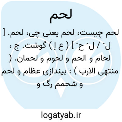 ( اسم ) گوشت جمع: لحام الحام لحوم: بیندازی عظام ولحم وشحمم رگ و پی همچنان و جلد مقشور ( منوچهری. د. ۳۸ )