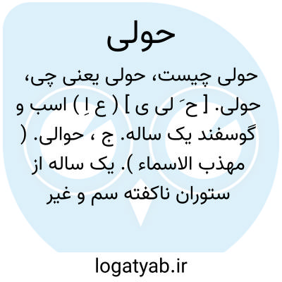حولی. [ ح َ لی ی ] ( ع اِ ) اسب و گوسفند یک ساله. ج، حوالی. ( مهذب الاسماء ). یک ساله از ستوران ناکفته سم و غیر آن. حولیة مؤنث آن و حولیات جمع آن. ( از منتهی الارب ). ستوران سم دار و غیر آن که یک سال بر آنها گذشته باشد: چون یکساله گردد [ بچه اسب ] حولی گویند. ( تاریخ قم ). و رجوع به صبح الاعشی ج 2 ص 30 شود.