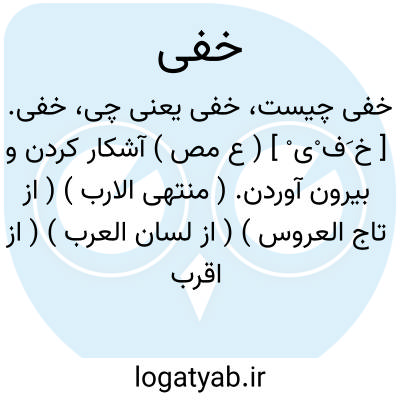 ( صفت ) ۱ - نهان پنهان پوشیده. ۲ - گوشه گیر. ۳ - روح ( باعتبار آنکه حقیقتش بر عارفان و جز آنان مخفی است ). ۴ - حق تعالی. یا خفی و جلی. پنهان و آشکار.