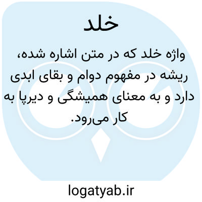 واژه خُلد که در متن اشاره شده، ریشه در مفهوم دوام و بقای ابدی دارد و به معنای همیشگی و دیرپا به کار می‌رود. در ادبیات عربی، این کلمه برای توصیف هر چیزی به کار می‌رود که از فساد و زوال مصون مانده و بر حالت اولیه خود باقی است؛ به عبارت دیگر، خلود بر دوری هر چیزی از عوامل تغییر و تباهی تأکید دارد. برای مثال، در گویش عربی، سنگ‌هایی که استحکام زیادی دارند و دیرینه می‌مانند، با صفت خوالد توصیف می‌شوند، که این نشان می‌دهد این ریشه در ابتدا بر پایداری فیزیکی و مقاومت در برابر زمان دلالت داشته است.