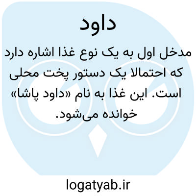 داود. [ وو ] ( اِ ) داود باشا. ظاهراً نام نوعی غذا باشد که از گلوله های گوشت تهیگاه و پیاز و جعفری ترتیب کنند. ( دزی ج 1 ص 430 ).