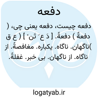 دفعه. [ دَ ع َ / ع ِ ] ( از ع، اِ ) دفعة. دفعت. بار. وهله. مرحله. ( فرهنگ فارسی معین ). باره. مرتبه. ( ناظم الاطباء ). یک نوبت. ( مقدمه لغت میر سیدشریف جرجانی ). کَرّه. کرت. پی. نوبه. نوبت. دست. مره: امیر محمود به دو سه دفعه از راه زمین داور بر اطراف غور زد. ( تاریخ بیهقی ).