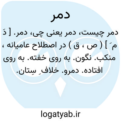 دمر. [ دَ م َ ] ( ص، ق ) در اصطلاح عامیانه، منکب. نگون. به روی خفته. به روی افتاده. دمرو. خلاف ِ سِتان. مقابل طاق باز. این کلمه هرچند در کتاب نیامده است ولی لفظی درست و قدیم است. ( یادداشت مؤلف ). بر روی خوابیده که در تازی منکوس گویند. ( آنندراج ). منکوس. ( غیاث ). به روی افتاده و به رو خفته و روی بر زمین نهاده. ( ناظم الاطباء ):
