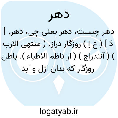 ( اسم ) ۱ - روزگار زمانه. ۲ - عهد عصر زمان دوره. ۳ - ( تصوف ) اسمائ الحسنی. ۴ - زمان نامتناهی است از لا و ابدا. ۵ - مقدار هستی و مدت و امتداد پایندگی ذوات بی ملاحظه امور متغیره حادثه چنانکه در زمان ملحوظ است جمع دهور. یا دهر اسفل وعائ و طباع کلیه را از حیث انتساب آنها بمبادی عالیه دهر اسفل گویند ( دررالفوائد ۱۴۸ ). یا دهر ایسر وعائ مثل معلقه ( ایضا ) یا دهر ایمن. وعائ عقول طولیه مترتبه و عرضیه متکائفه ( ایضا ). یا دهر کاسه گردان روزگار جهان پایین عالم سفلی.