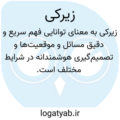 زیرکی به معنای توانایی فهم سریع و دقیق مسائل و موقعیت‌ها و تصمیم‌گیری هوشمندانه در شرایط مختلف است. افراد زیرک معمولاً توانایی تشخیص نکات مهم و کلیدی را دارند و می‌توانند با استفاده از دانش و تجربه خود، راه‌حل‌هایی کارآمد و خلاقانه برای مشکلات پیدا کنند. زیرکی بیشتر به هوش عملی و درک عمیق موقعیت‌ها مربوط می‌شود تا صرفاً داشتن اطلاعات زیاد.