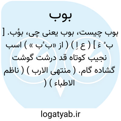 بؤب. [ ب ُ ءَ ] ( ع اِ ) ( از «ب ٔب » ) اسب نجیب کوتاه قد درشت گوشت گشاده گام. ( منتهی الارب ) ( ناظم الاطباء ) ( آنندراج ).