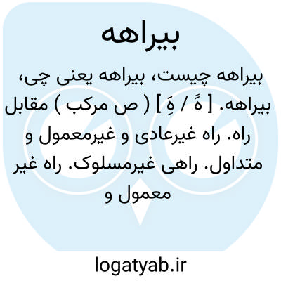 بیراهه. [ هََ / هََِ ] ( ص مرکب ) مقابل راه. راه غیرعادی و غیرمعمول و متداول. راهی غیرمسلوک. راه غیر معمول و مسلوک. راهی غیرمعروف. راهی که همگان از آن نروند. طریق غیرمسلوک. ( یادداشت مؤلف ). راه دشوارگذار.
